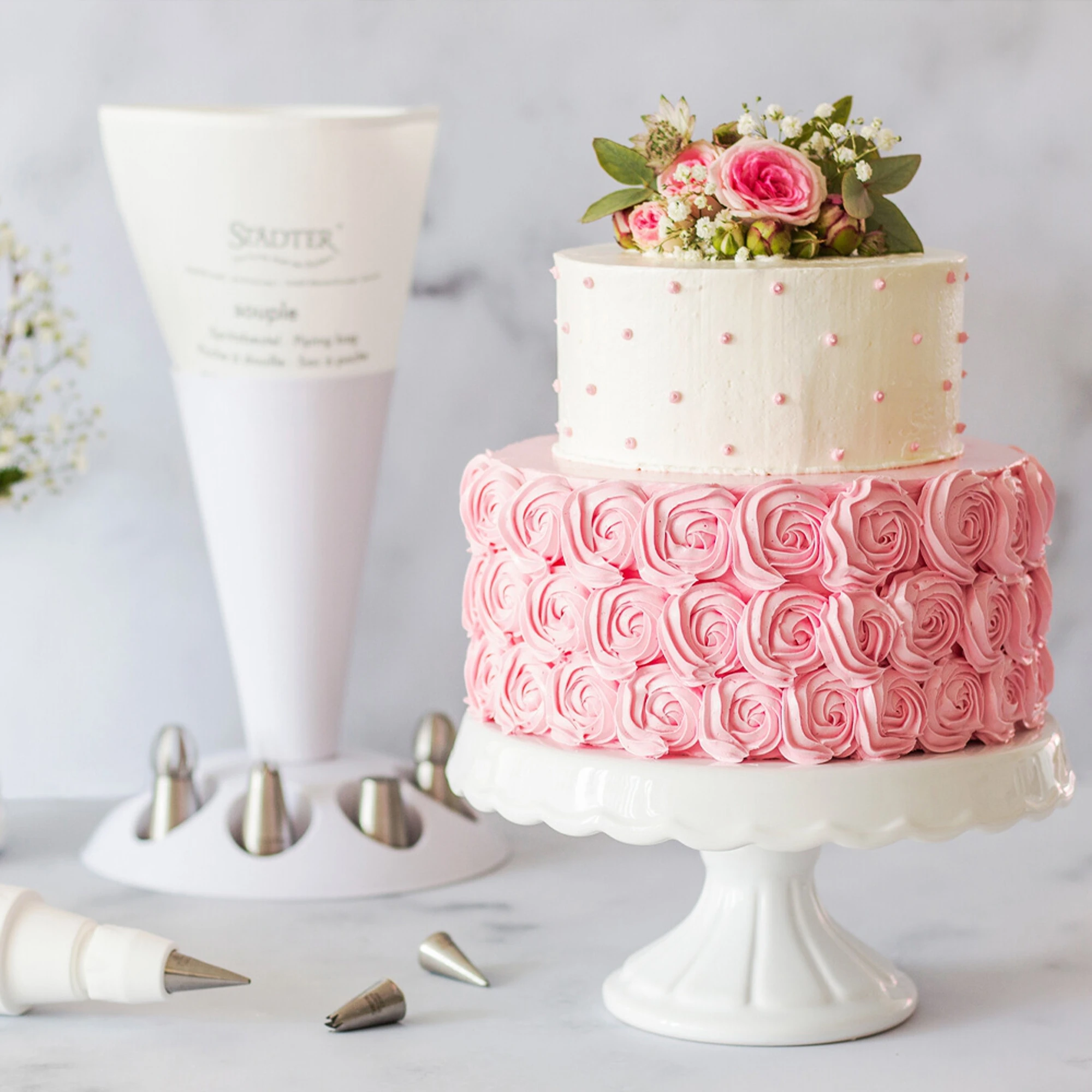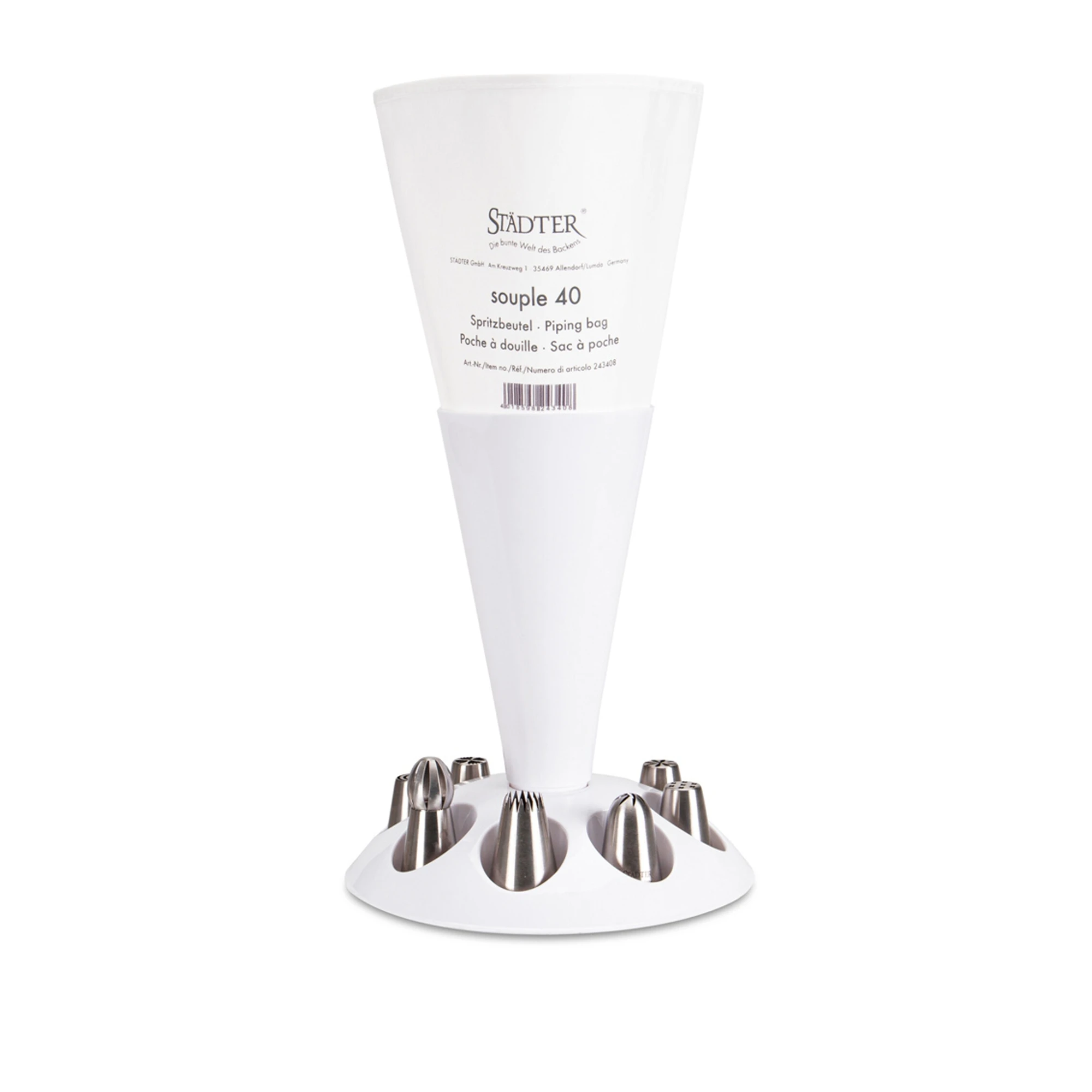 Der Absetzständer von Städter soll Ihnen die Handhabung der Spritzbeutel vereinfachen. Er erleichtert das Einfüllen und Trocknen der Beutel und kann zum Absetzen zwischen den Spritzvorgängen benutzt werden.