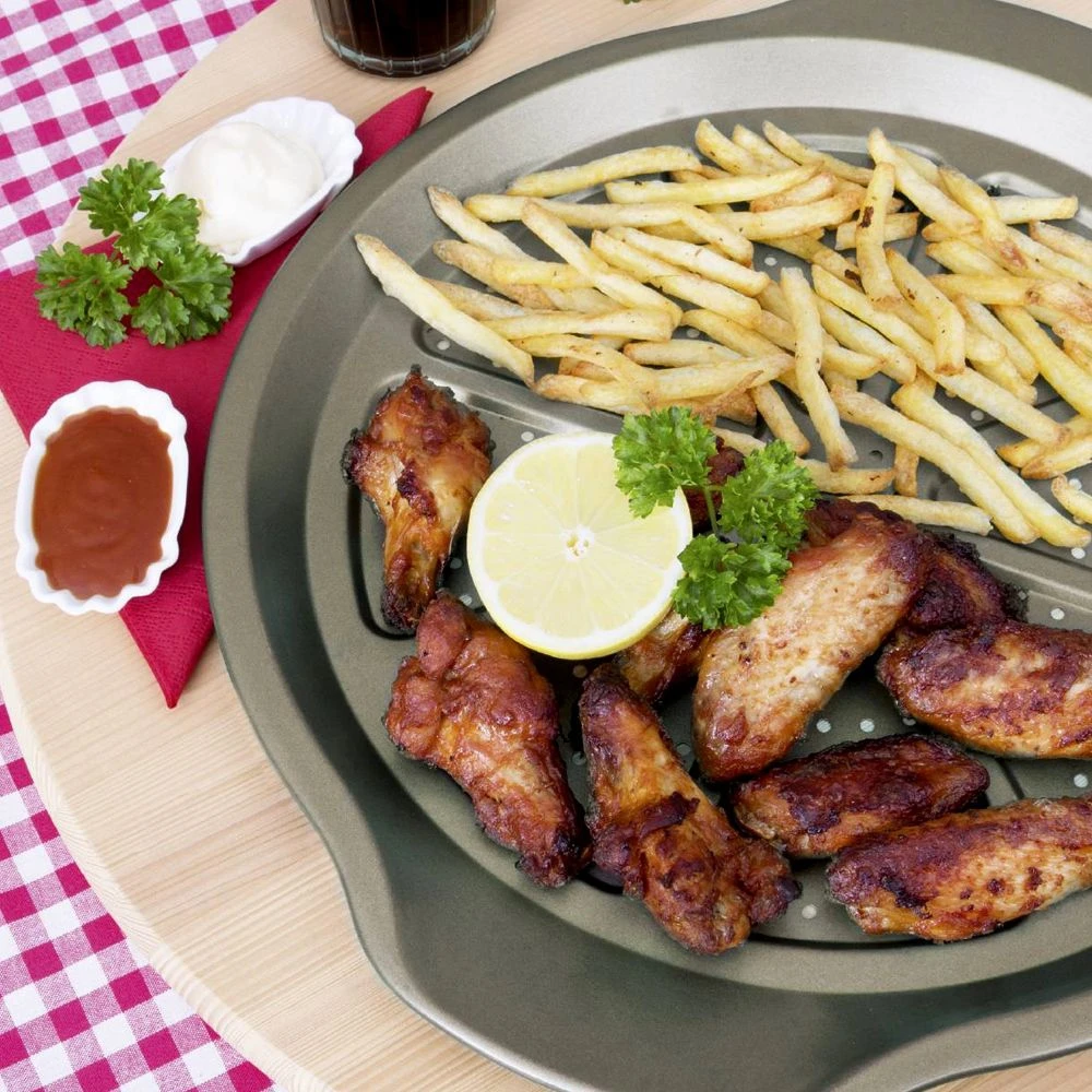 Die optimale Wärmeleitung und die Spezial-Lochung lassen Pizza und Pommes nicht nur besonders knusprig werden, sondern reduzieren auch den Fettanteil in der Zubereitung. Unser Backblech ist in Profi-Qualität gefertigt. Die Form nimmt die Wärme gut auf und sorgt so für ein gleichmäßig gutes Backergebnis. Durch die Spezial-Lochung erzielen Sie ein besonders knuspriges Backergebnis.