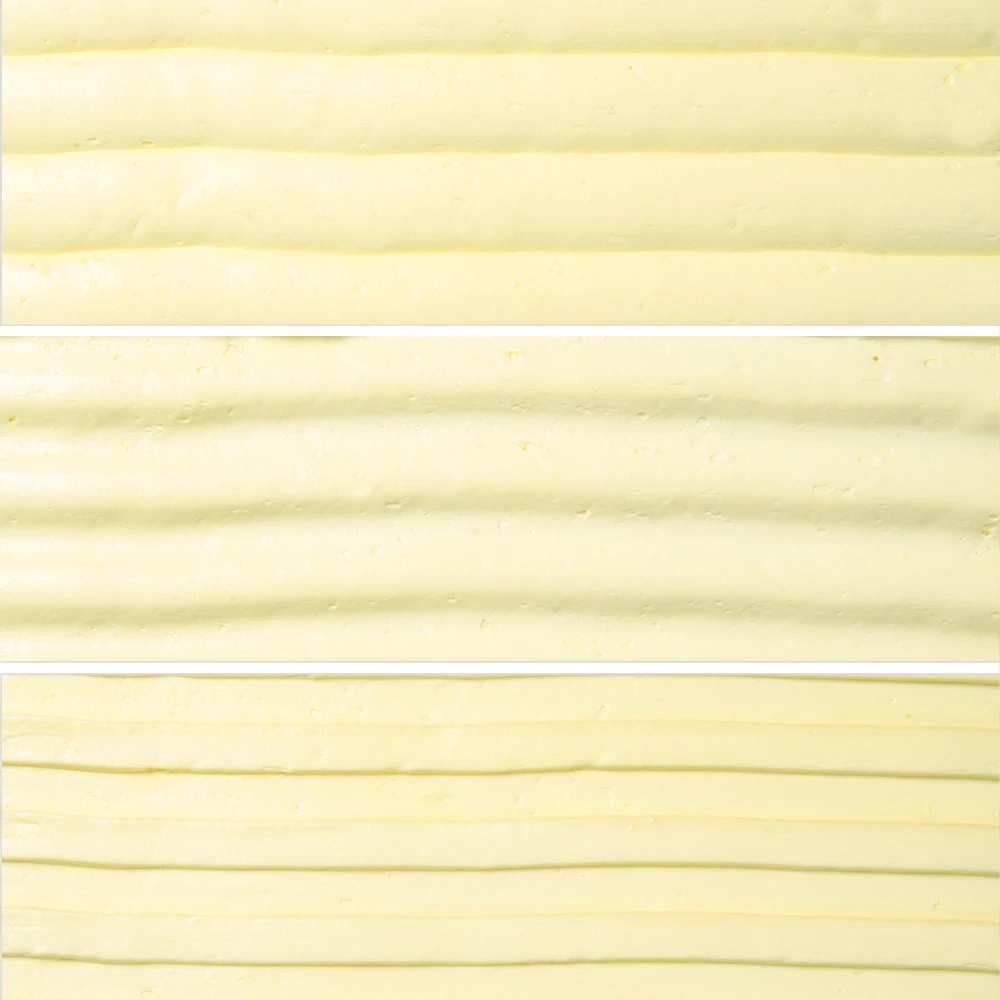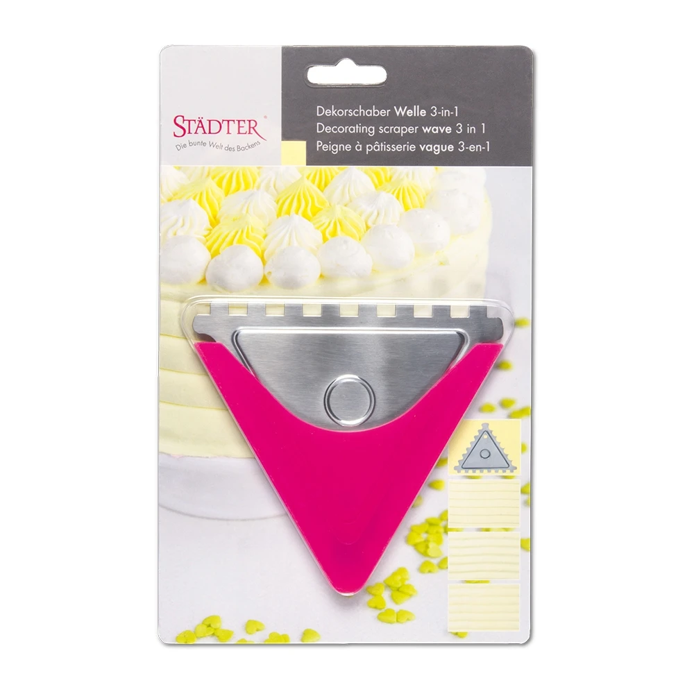 Deko-Schaber für exakte Garnierungen von Tortenrändern und Kuchenoberflächen. Kreeirt 3 unterschiedliche Wellen – Muster.