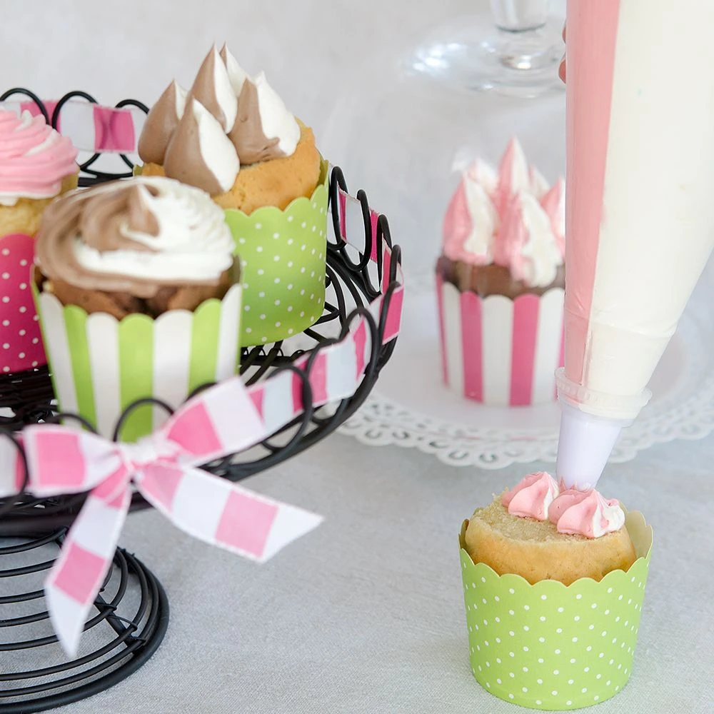 Mit diesem Set ist es ganz leicht, zweifarbige Spritzdekorationen selbst herzustellen. Der Zweikammer-Einwegspritzbeutel kann mit zwei verschiedenfarbigen Cremes befüllt werden. Die Farben bleiben während des gesamten Spritzvorgangs sauber getrennt. Durch den Adapter mit Schraubverschluss lassen sich die Tüllen selbst bei gefülltem Spritzbeutel wechseln.